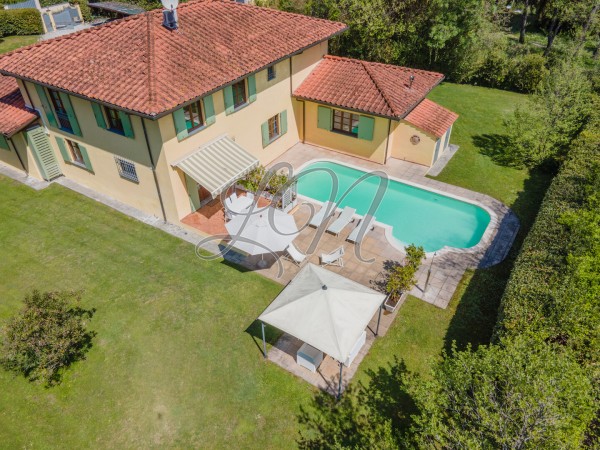 VILLA INCANTEVOLE con piscina scenografica , esotico giardino e veranda esterna , così composta: a PIANO TERRA: ingresso, ampio e luminoso soggiorno con sala da pranzo, cucina abitabile, 1 camera da letto singola e bagno di servizio con doccia. PIANO PRIMO: 1 Suite padronale completa di bagno con vasca oversize per due persone, doccia a soffitto e balcone privato con splendida vista sulle Apuane, 1 camera matrimoniale, 1 camera con tre letti singoli e un bagno completo.